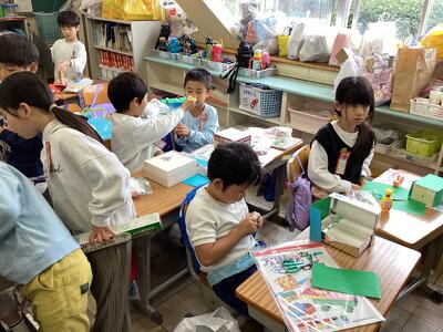 先週の図工の時間に,「うきうきボックス」を作りました。この学習では,まず,自分が持ってきた箱の中から好きな形のものを選びました。そして,その箱に飾り付けをして動物,自動車,家,宝石箱など,色々なものに変身させました。活動時間中,子供たちは夢中になって飾り付けをしていました。「お家の中も作ったよ」「わにさんの歯もつけたよ」などと,嬉しそうに話していました。休み時間に,自分の作品で遊ぶ姿も見られました。
