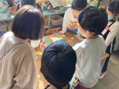 様々な色のお花紙をちぎったり丸めたりして作品をつくりました。「ぎゅっとするとお花紙が固くなったよ」「カラフルな花をたくさん作ってお花畑みたいにしたよ」「ひらひらしているから魚のヒレにしてみたよ」などと子供たち一人ひとり楽しみながら思い思いの作品をつくる姿が見られました。
