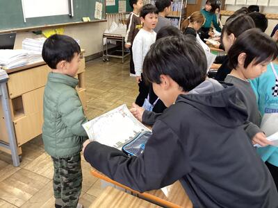 18日に1組と2組が,19日に3組が,でき上がった手紙を6年生に届けに行きました。ドキドキしながら,6年生に渡していました。6年生がにこにこしながらお礼を言ってくれて,1年生は大喜びでした。6年生と一緒に手紙を読む姿も見られ,心が温かくなりました。教室に戻ると,「ドキドキしたけど,6年生が喜んでくれて,私も嬉しくなりました」「渡せてよかった」などと,笑顔で話していました。