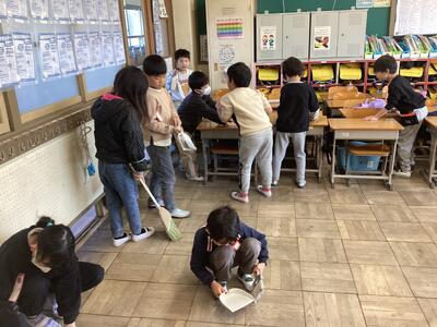 通常の清掃活動の分担場所を掃除したり,自分の机,いす,ロッカー,靴箱などを雑巾で拭いたりしました。どの子も一生懸命に活動し,教室,廊下,昇降口,机,ロッカーなどがピカピカになりました。大掃除が終わると,どの子も笑顔を見せていました。充実した活動となりました。