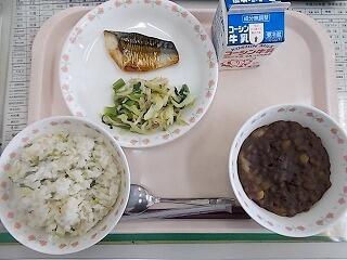 今日のメニューは,七草ごはん・鯖のゆうあん焼き・ほうれん草の辛子和え・白玉小豆・牛乳でした。