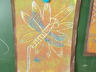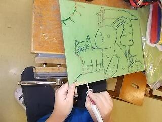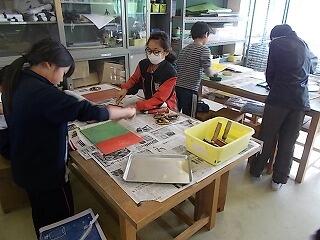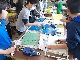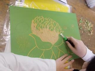 図工の版画の刷り方の説明をしっかり集中して聞いています。