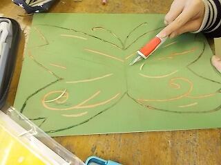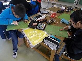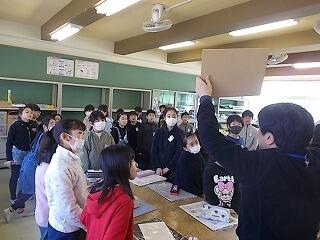 図工の鑑賞会。卒業記念で作った世界に一つだけのオリジナル作品です。12月から取り組み,1か月かけて完成しました。友達の作品の良いポイントをたくさん見つけます。