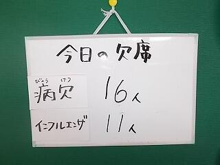 本日はインフルエンザの児童が13人(昨日11人)・病欠が11人(昨日16人)です。週末の過ごし方に十分気を付けてください。