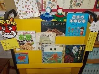 2/3(日)の節分に向けて図書室には,節分や豆,鬼に関する本などが紹介してあります。