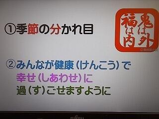 校長先生のお話では,節分では豆まきをして,自分の心の中の鬼を退治しましょうというお話がありました。豆には鬼を退治するパワーがたくさん詰まっており,食べると病気になりにくいというお話もありました。