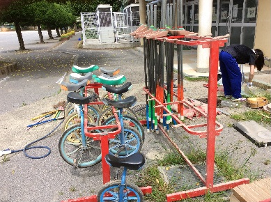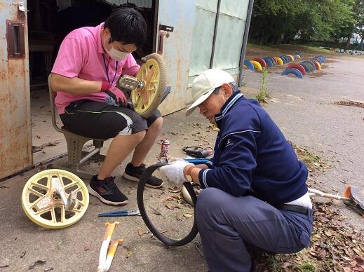 パンクした一輪車は機械作業が得意な先生たちに直してもらいました。
