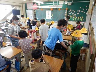 緊急放送と同時に,どの子もさっと机の下に潜り込み,頭を守る行動をとりました。廊下に整列する際にも,すばやく防災頭巾をかぶり,静かに整列することができました。入学したばかりの1年生も,何度も訓練を行っている6年生もみんな真剣に取り組んでいました。