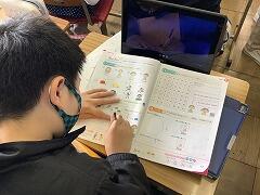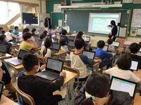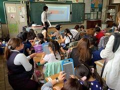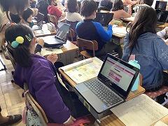外国語が教科になった5年生では,教科書のQRコードを読み取って,音声を聞いて耳慣れをしています。担任の先生や外国語授業支援員・ALTの先生がほかの友達の質問に答えていると,なかなか質問するまでに時間がかかってしまいます。そんなときには,端末で読み取ることで,解決することもできます。