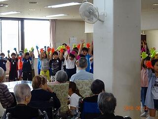 4年生は総合の福祉の学習で,酒小の目の前にある輝陽園に行き,お年寄りとの交流活動を行いました。