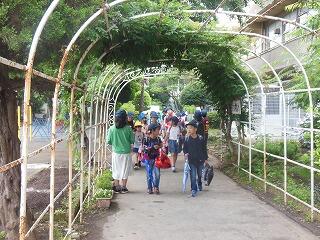 「なかよしトンネル」の上の藤のつるもだいぶ生い茂ってきました。まさにトンネルを作っています。