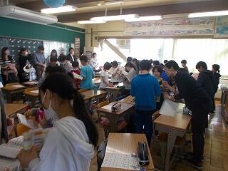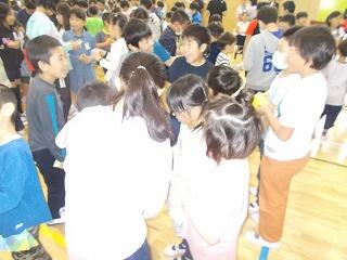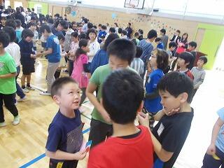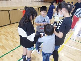 異学年で名刺を交換し合い,全学年の友達と交換できると,ある文字が出来上がります。(名刺の裏に,ある文字が書かれてあります)