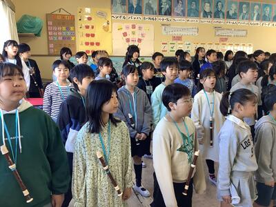 リコーダーは指使いが難しく,毎日一生懸命練習してきました。合唱は,アルトとソプラノに分かれてのハーモニーに挑戦しました。本番前は,「心臓がバクバクする~。」「足が震えてる~。」と緊張した様子でしたが,121人の元気いっぱいで素敵な歌声と音色を届けることができました。
