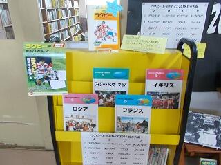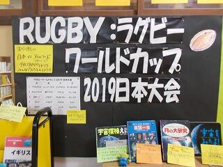 テレビなどでも話題となっておりますラグビーワールドカップですが,図書室でもその話題を取り上げて,子ども達が関連した本に興味・関心をもてるように図書館指導員の稲垣先生が工夫をして,取り組んでいます。