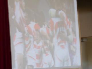 明後日は,吹奏楽部のマーチングの東関東大会が神奈川県の小田原アリーナで行われます。今日の給食の時間を使い,「吹奏楽部を励ます会」が開かれました。TV放送で,マーチングの様子がうつされました。曲名は「マードックからの最後の手紙」と