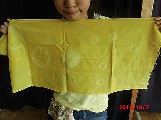 マリーゴールドの花を使って,手ぬぐいを染めました。