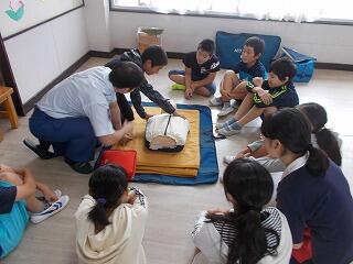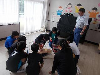 実際に児童だけで心臓マッサージを行う人,AEDを持ってくる人など役割分担をして,一人一人が実際に体験をしました。