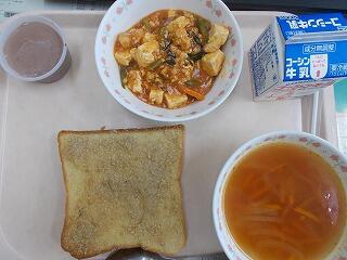 メニューは,セサミトースト・豆腐とトマトのチリソース煮・人参スープ・プリン・牛乳です。