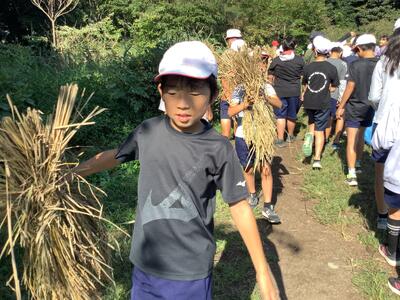 次回は、取れた稲を使ってクリスマスのリースやお正月のしめ縄を作ります。その為の稲を教員がもっていると,「みんなで,順番で持ちます」と協力して運ぶ姿に頼もしさを感じました。