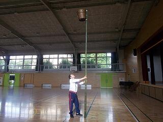今年度は,PTA競技が綱引きから玉入れに変わりました。普通の玉入れでは物足りないのではということで,かごの位置を高くして難易度の高いこのような玉入れのかごを作りました。この竹は草の会の石澤様が竹を切って用意して下さいました。