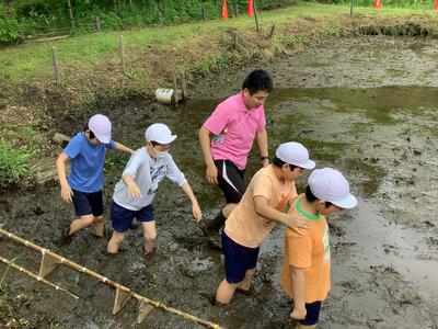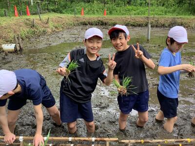 田んぼに入るときには「うわぁ、ぬるぬるする」「足がもっていかれる」と初めての感覚に興奮している様子でした。時間が経過するにつれて,職人のようにスムーズに田んぼの中を歩けるようになったり,テンポよく苗を植える様子でした。顔や身体を泥まみれにして,一生懸命活動することができました。