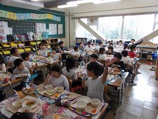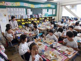 今週から給食の時間に校長先生が会食として,学級の中で食べることになりました。1年生から6年生まで順番に入られます。今日は1年2組に入られました。子ども達も嬉しそうです。