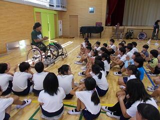 東京オリンピック・パラリンピックが話題になっておりますが,本校では,5・6年生を対象に車いすバスケットの選手と車いすラグビーの選手をお招きして,障がい者アスリートと一緒にスポーツを体験し,自分を含めて全ての人が無限の可能性を秘めている存在である事に気付いたり,競技性の高さや面白さを体感したりするすることができました。