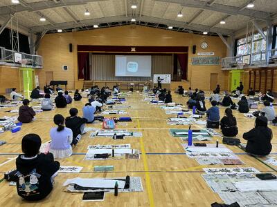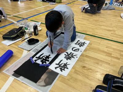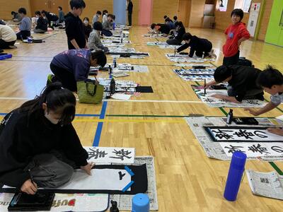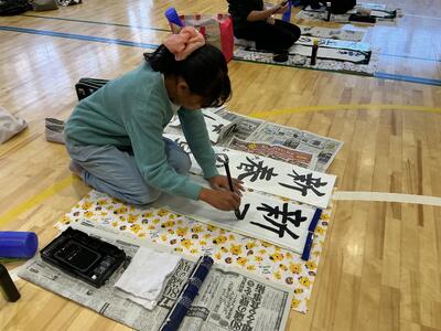 12月10日(水)に4年生は、体育館で書き初め練習を行いました。一画一画丁寧に気持ちを込めながら、静かな空気の中で集中して筆を運ぶ姿がとても素敵でした。できあがった作品からは子供たちの成長や頑張りを感じました。