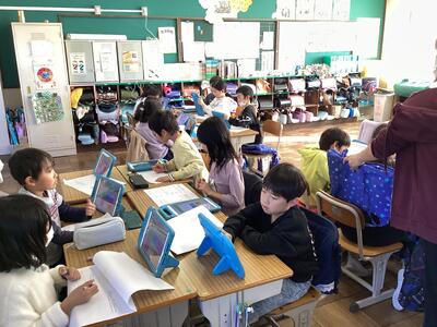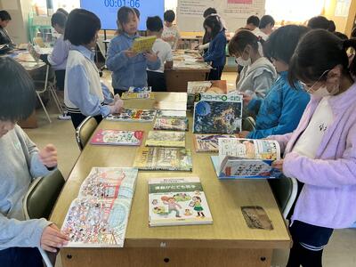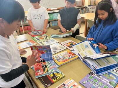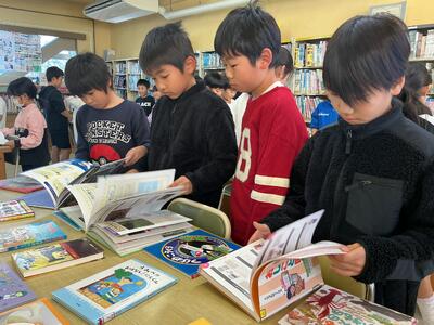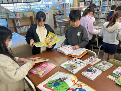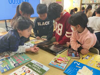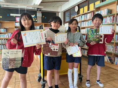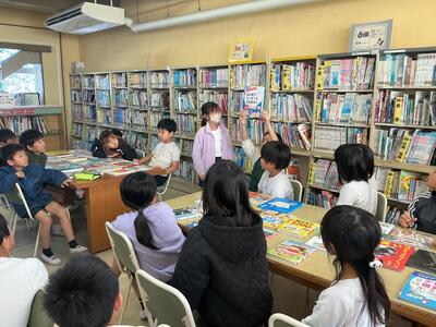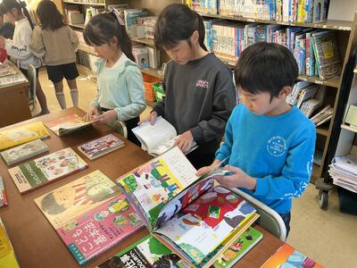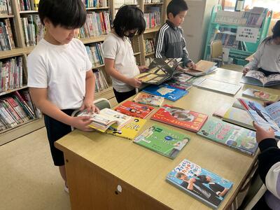 毎週1回、各クラスで図書館を利用しています。その際に1人2冊借りることができ、今回はどんな本を借りようかなと楽しみにしている児童がたくさんいます。また、学校図書館指導員の方が読み聞かせをしてくださいます。最近学習した内容に関連付けたり、季節の行事に合わせたりと、毎回工夫をしてくださるので、「今日は何だろうな」とわくわくしています。本を借りる際に、読み聞かせしてもらった本のシリーズを手に取る児童もいます。