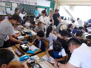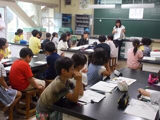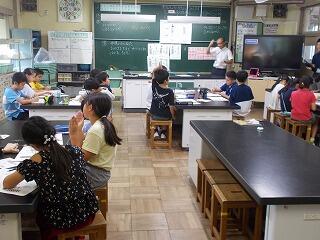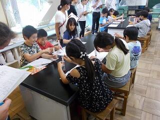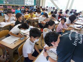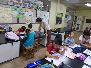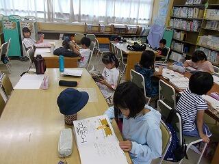 夏休みを使って,図書室を開放し,調べ学習教室を開いています。合計9日間開催し,自分の予定に合わせて,参加をします。本日は19名の参加でした。それぞれ自由研究などで調べたいことを図書室の本を活用しながら調べていきます。それを職員で助言しながら,進めていきます。