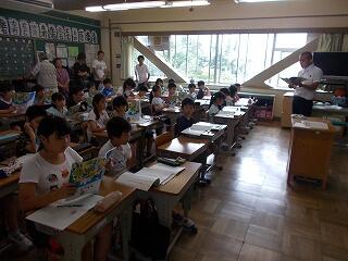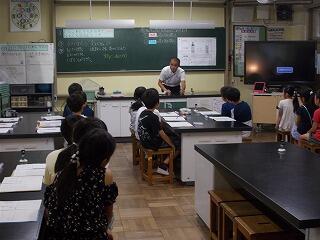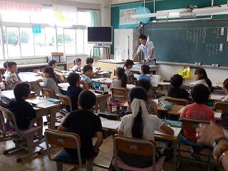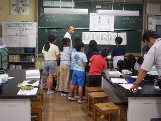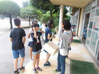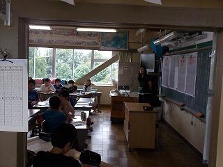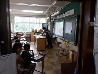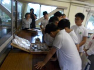 まずは,校舎内の案内です。給食室や理科室(化石の標本等)等を見て回りましたが,興味津々でした。職員がついて,案内をしました。