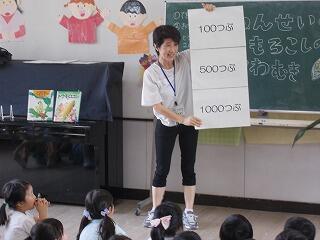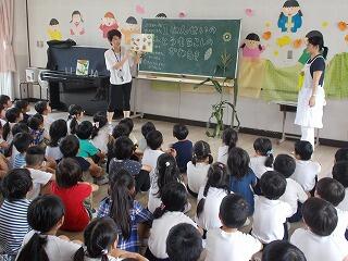 皮むき体験の前に図書館指導員の稲垣先生から本の読み聞かせと粒のクイズがありました。