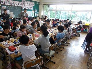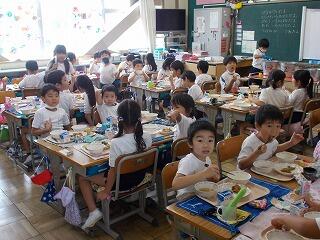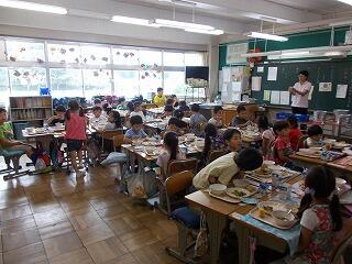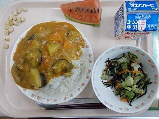 今日で1学期の給食も最後となりました。最後は,子ども達の大好きなカレーライスと小玉スイカでした。カレーは,にんにくも入ったスタミナ満点の夏野菜のカレーライスです。調理員さんも毎日朝早くからお仕事して下さり,いつも美味しい給食をありがとうございます。