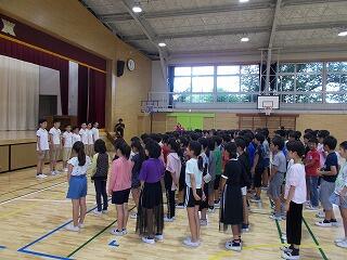 表彰も2つあり,1つは6月に行われたミニバスケットボール教室「優秀選手賞」の表彰がありました。2つめは,健歯コンクール「優良賞」の表彰です。賞状と「かむかむ大使」のたすきがつけられました。