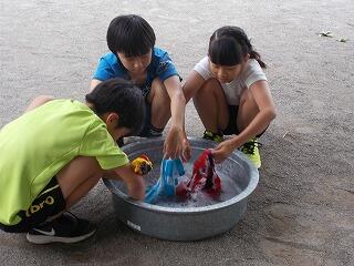予定では,上下の服を着て靴をはいた状態で水の中に入り,ビニール袋や空のペットボトルをどう扱うと,浮くことができるかを体験する予定でした。実施できず,残念です。