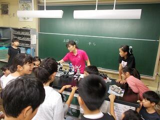 顕微鏡を扱い,葉の様子を細かく観察します。理科支援員の宮崎先生も色々と補助をしてくださっています。