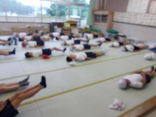これは寝ているわけではなく,足上げ腹筋をしているところです。