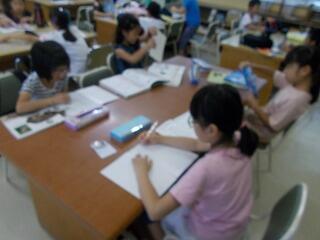本日も図書館を活用して,「夏休み調べ学習教室」がありました。昨日に続いて20名近い参加者でした。目的をもって,自分で必要な情報を探してまとめていく姿には感心させられます。