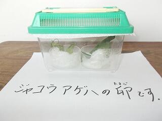 理科室前の廊下にジャコウアゲハの卵を展示しています。見づらいですが,葉にすごく小さな赤い卵がいくつか付いています。成長する様子を子ども達に見てもらい,命の尊さや成長過程などを学んだり,色々感じてもらえると嬉しいです。
