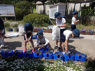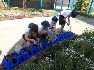 2年生が生活科で,ミニトマトの苗を鉢に植えていました。「大きくなってね