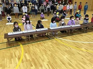 体育館にひな壇を出して,みんなの顔が見えるように並んでいます。最初は,うまく声が出ませんでしたが,
