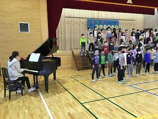 だんだんと子どもらしい元気な歌声が体育館に響くようになりました。音楽専科の鈴木先生のご指導のもと,