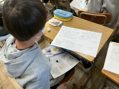 算数の授業では、今まで勉強してきた事の「まとめ」をしています。 しんと静まりかえった教室で、みんな一生懸命難しい問題にも諦めずに取り組んでいます。