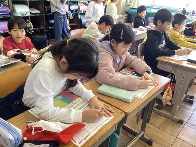 3学期がスタートしました。「お年玉もらった!」「おじいちゃん、おばあちゃんの家に行った!」などと、嬉しそうに話してくれる児童がたくさんいました。今日から給食、掃除も始まり、少しずついつも通りの生活が戻ってきました。