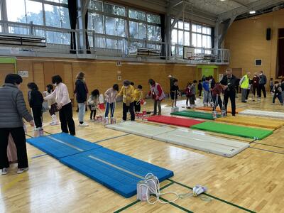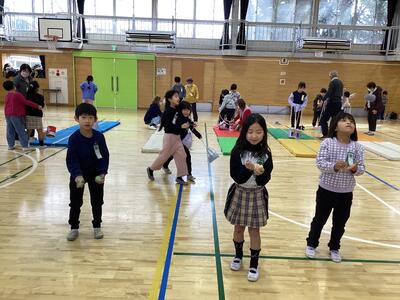21日(水)の2、3時間に体育館で昔遊び交流会を行いました。こま、けん玉、あやとり、お手玉、かんぽっくりの遊びをグループごとに回って楽しみました。どの子もサカスクの方の話を熱心に聞く姿が見られました。「先生、見て!できるようになったよ」「一緒にやってもらったらこまが回せたよ」「〇〇さんすごい」などと言っていました。教室に戻ってきてから、お礼の手紙を書きました。自分たちで文章を考え、丁寧に色塗りをする姿が見られました。
