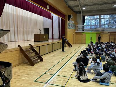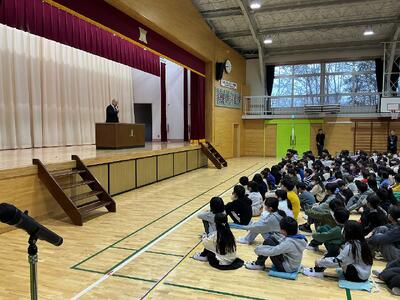 体育館に全校児童が集まり、第3学期の始業式を行いました。