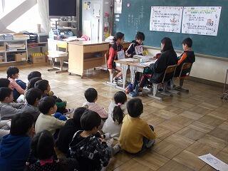 6年生が考えたお話を1年生に発表しました。6年生も劇風に聞き手を意識して,上手に発表しておりました。1年生は真剣な眼差しです。交流学級なので,なおさら普段お世話になっているお兄さん,お姉さんの発表を聞き入っていました。
