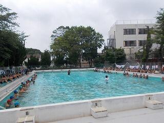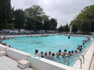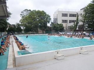 学年で1つの円を作り,流れるプールを行いました。逆回りになると,水の抵抗をものすごく受け,水圧のすごさを感じました。子ども達はこの流れるプールが大好きなんです。「キャー!キャー!」言いながら,楽しんでいました。