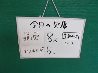 1年1組は,明日まで学級閉鎖となります。今日は,2年生でインフルエンザと発熱等による欠席が増えつつありますので,気を付けてください。