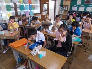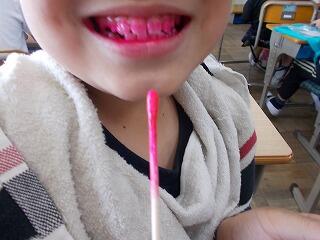 昼休みに保健委員会の児童が中心となり,歯の染め出し検査がありました。しっかり磨けていない部分は,赤く染まります。中には,あまり赤く染まらず,しっかり磨けている様子が見られる児童もいました。